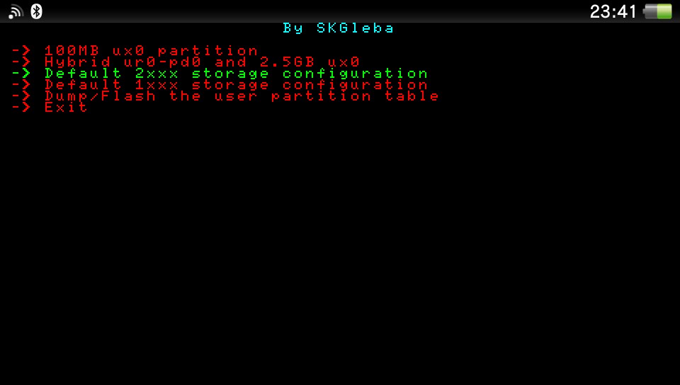 3. Navigate to "Default 2XXX storage configuration" and press X, this will repartition vita's internal storage in the style of PCH-2XXX / SLIM units and reboot.