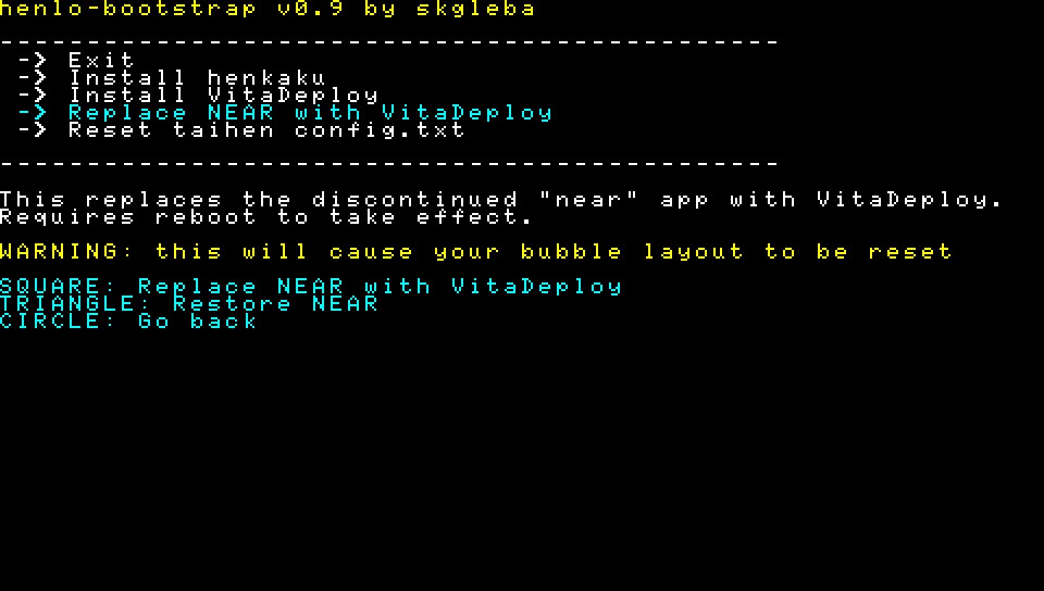 4. Navigate to "Replace NEAR with VitaDeploy", press CROSS and then SQUARE, this will install the homebrew toolbox and reboot the console.\